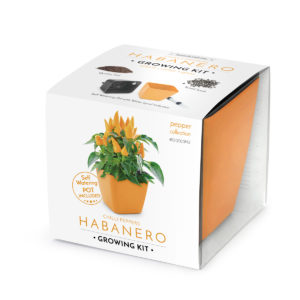 Habanero szett termesztésre (Habanero growing kit). Ez a szett dizájnos ön-öntöző virágcserepet, friss ültetőföldet, magokat a termesztésre és útmutatót tartalmaz.