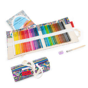 Zsírkréták összetekerhető vászontokban hegyezővel és hosszabbító bővítménnyel, 36 darab, ETNO motívumok, Cuculo, stresszmentesítő kifestők INGYEN